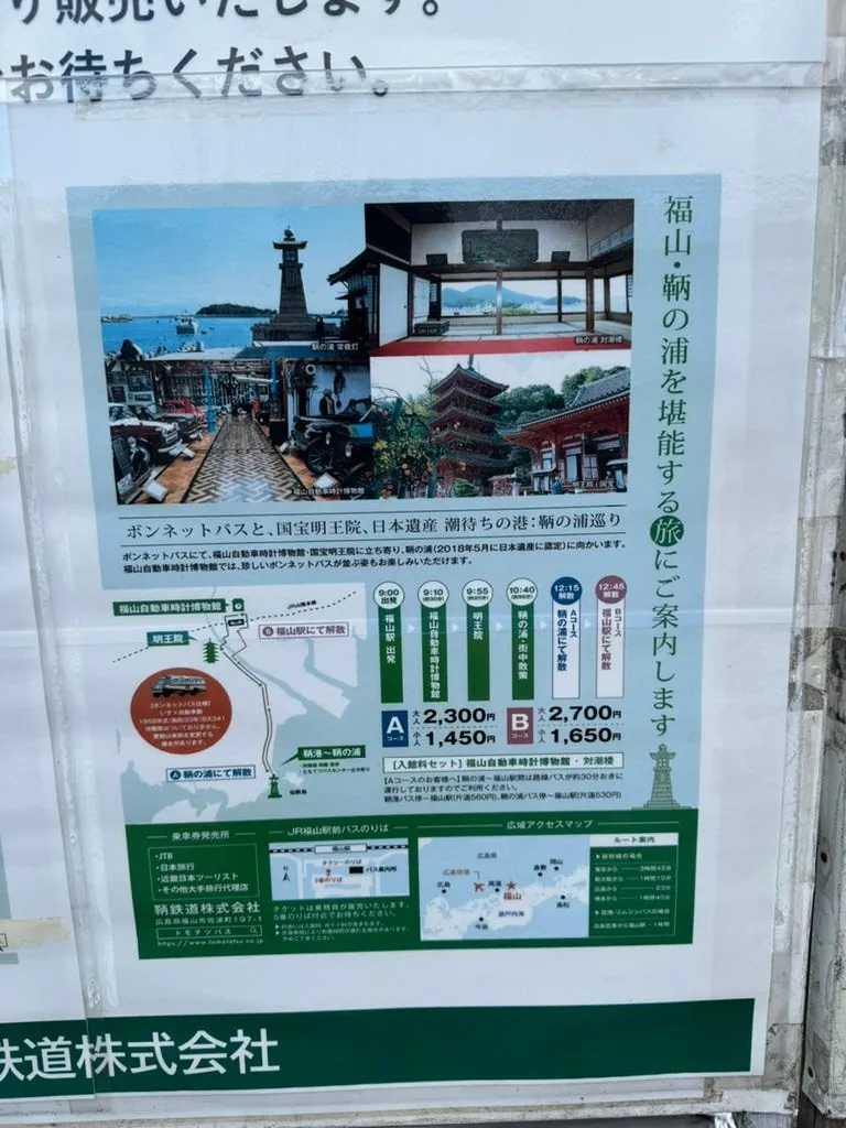 鞆の浦で有名な滋養強壮の保命酒があり、道中は薬酒の香りが濃厚でした。まだ暗くなる前に広島へ戻るため、バスに乗って福山へ向かいました。