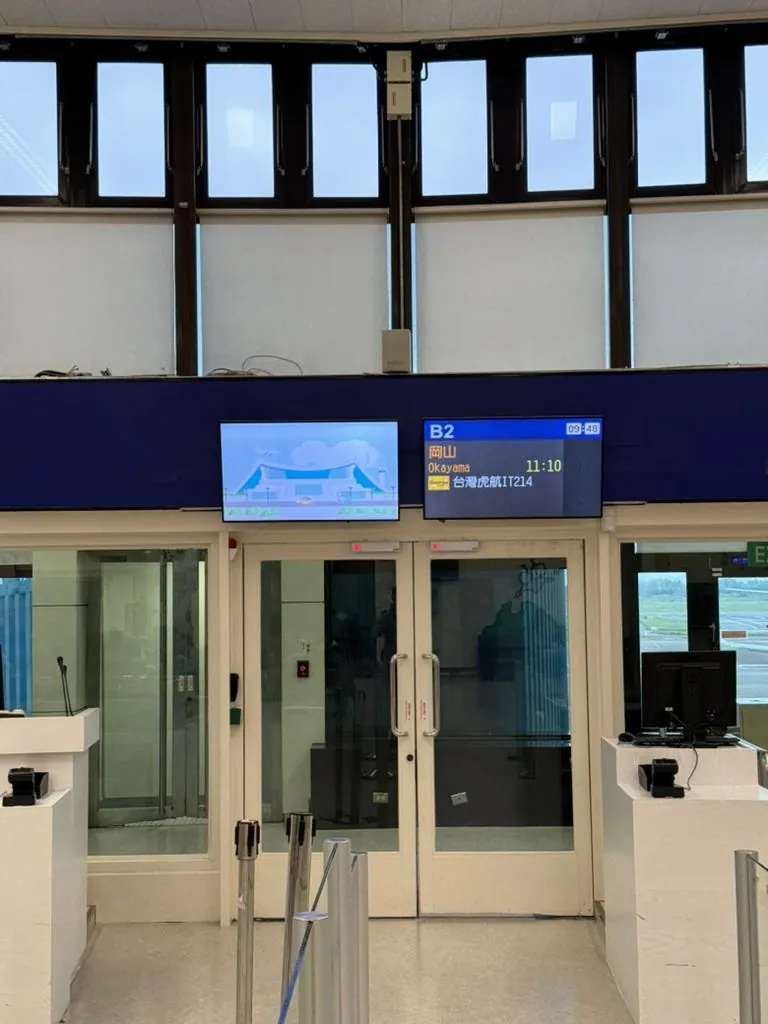 空港の便数が非常に少なく、同じ便の人だけで、チェックインと荷物預けが15分もかからず完了しました。特に岡山空港はとても小さく、X線検査は空港ロビーに設置されており、ロビーでX線検査を通過して封印シールを貼った後にチェックインします(荷物を開けると再度セキュリティチェックが必要です)。