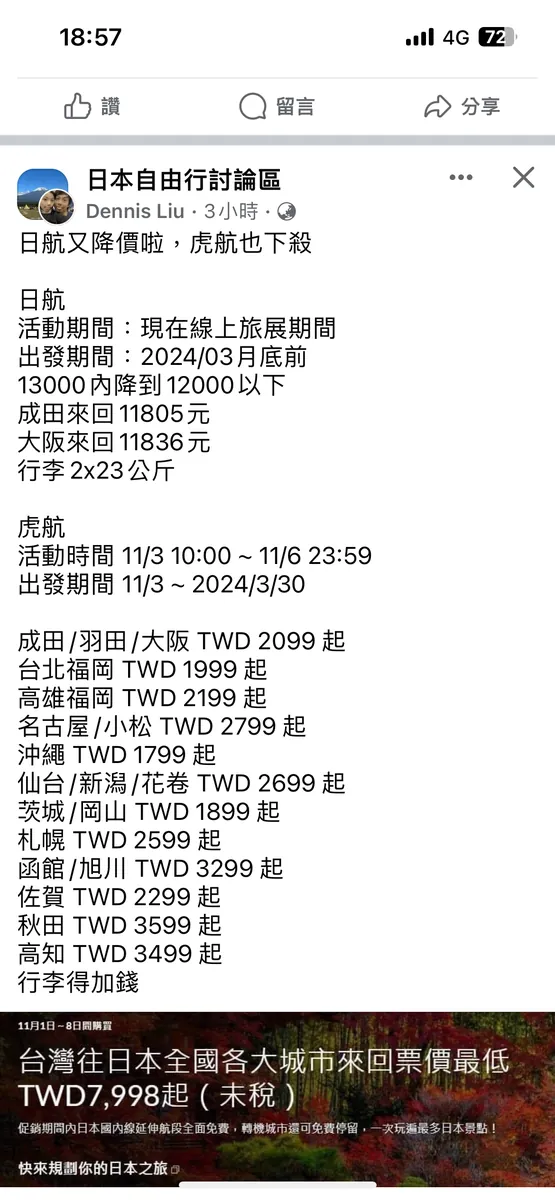 10/31 暇つぶしにFacebookを見ていたら、「日本自由行討論區」というグループで航空会社の割引セールの投稿を見かけました。そこで虎航が11/3 10:00~11/6 23:59まで割引チケットを販売しているのを知りました。運任せの気持ちで応募したところ、幸運にも割引チケットを購入できました。