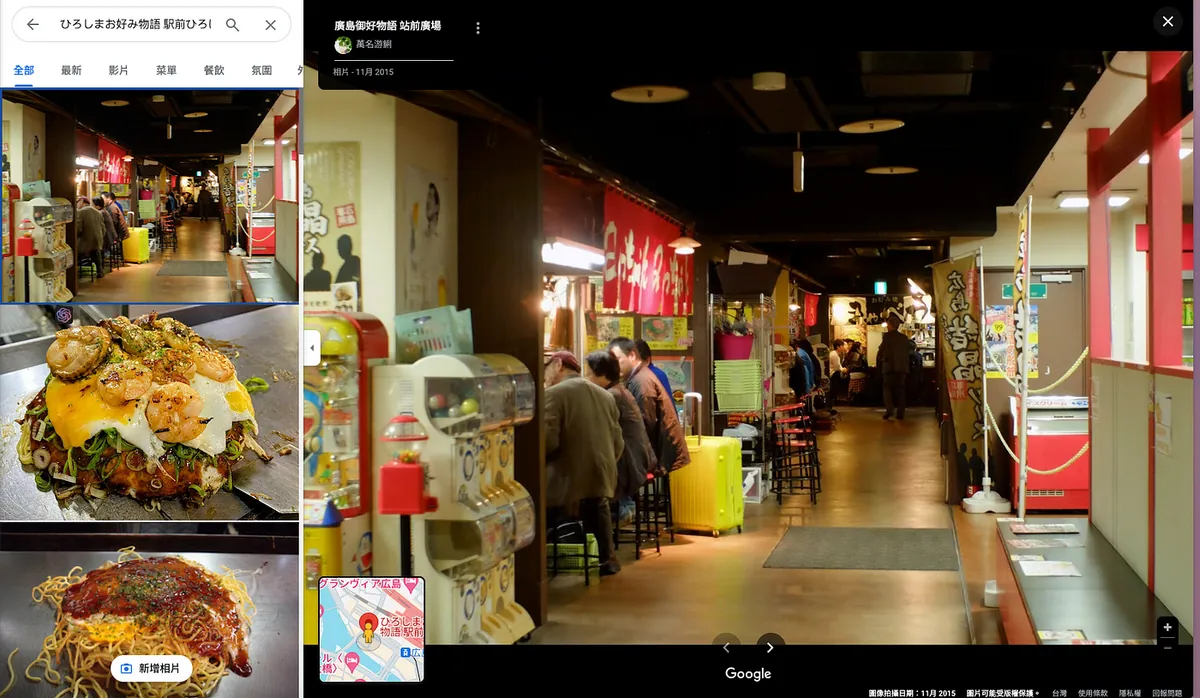 広島駅に戻って広島風お好み焼きを食べるなら、「広島お好み物語 駅前ひろば」がおすすめです。広島駅を出て右手の6階(Ekie百貨店の隣)にあります。エレベーターを降りるとすぐに特別な雰囲気が感じられ、このフロア全体がお好み焼き店で埋め尽くされており、自分の好きなお店を選んで座れます。