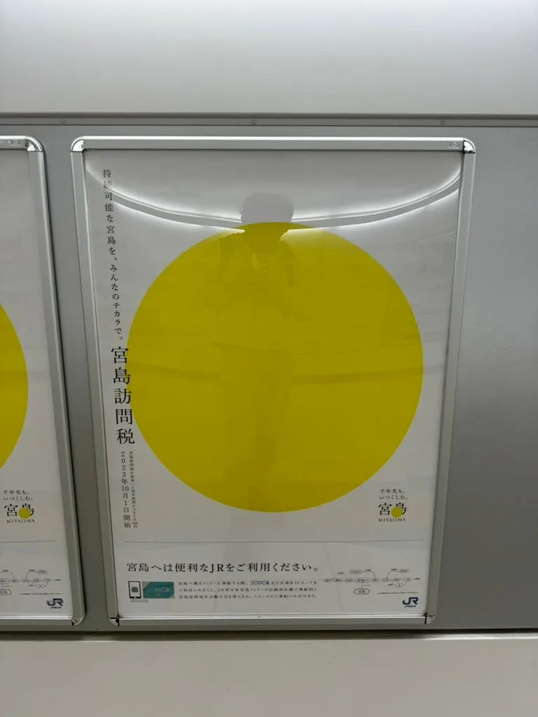 早朝にJRで宮島口駅へ向かい、駅を出て桟橋方向に歩くとフェリー乗り場があります。JRパスには宮島フェリーの乗船券が含まれているため、別途乗船券を購入する必要はありませんが、宮島訪問税(¥100)を別途支払う必要があります。駅員が訪問税のチケット購入を案内してくれます。