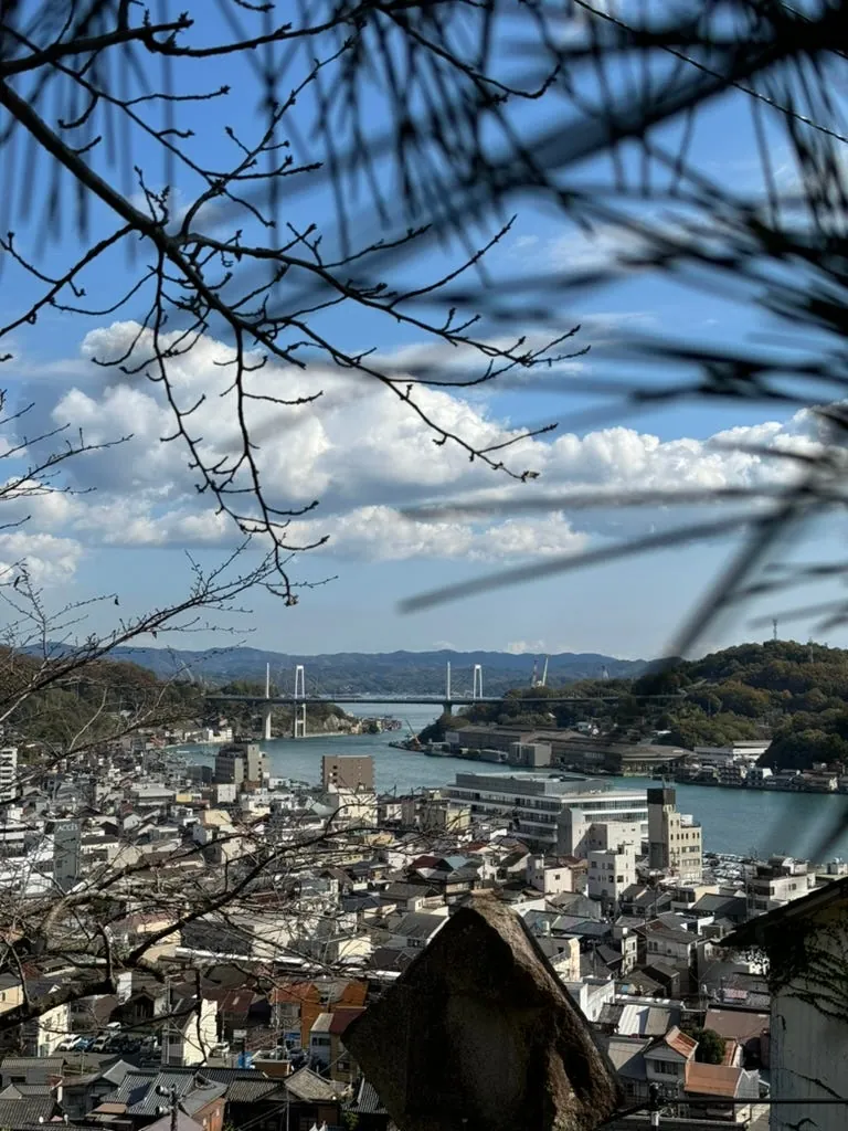 高い場所に着くと、視界は「神社」から「群島」へと変わります。瀬戸内海の小さな島々がパズルのピースのように散らばっており、とても癒されます。