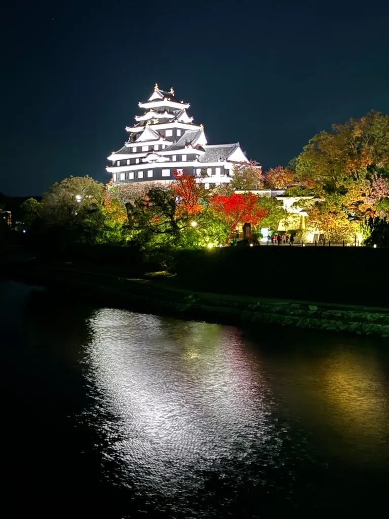 岡山城は「烏城」として知られており(外観が黒っぽい)、夜間のライトアップと周辺の紅葉の組み合わせがとても雰囲気があります。