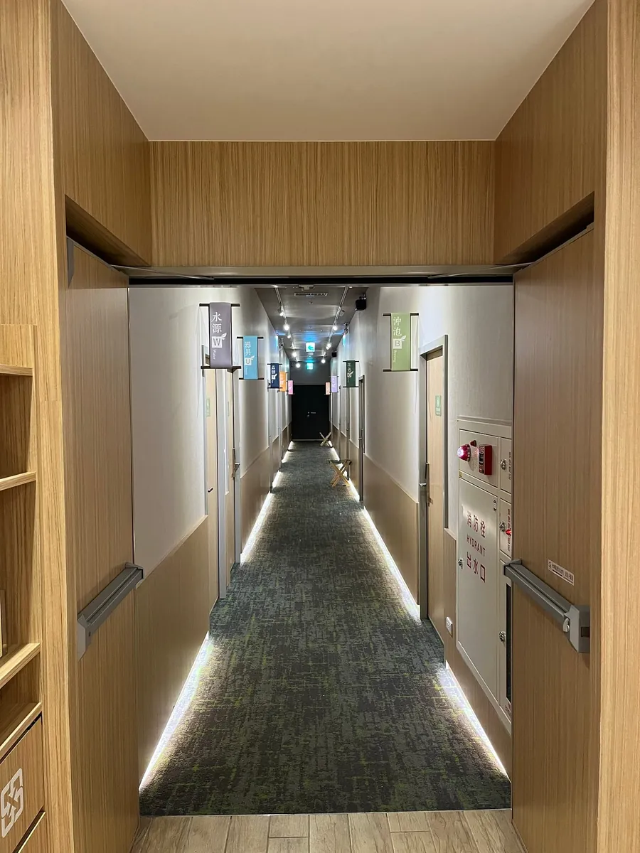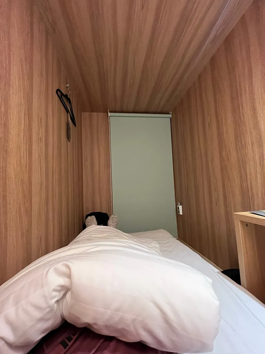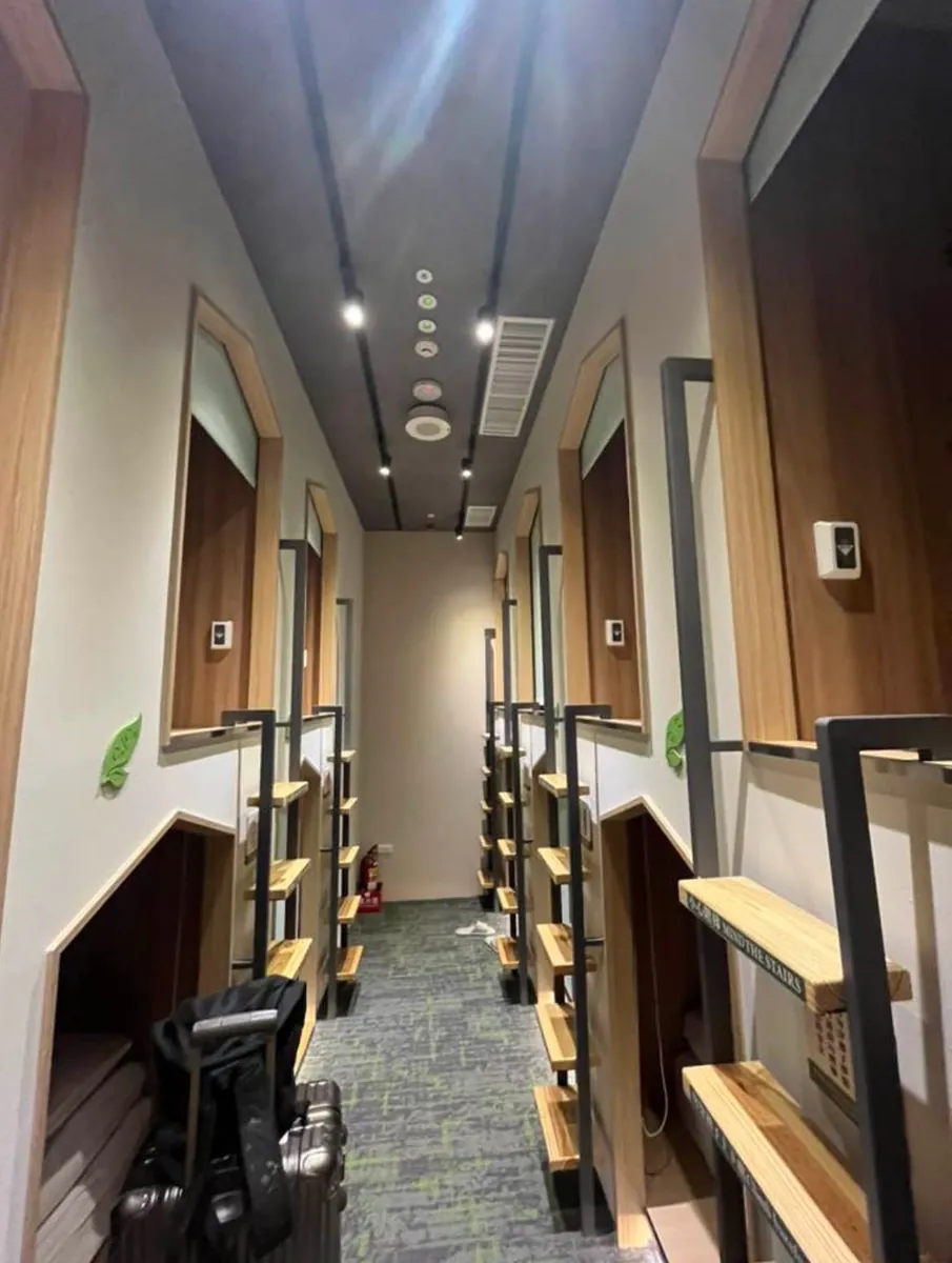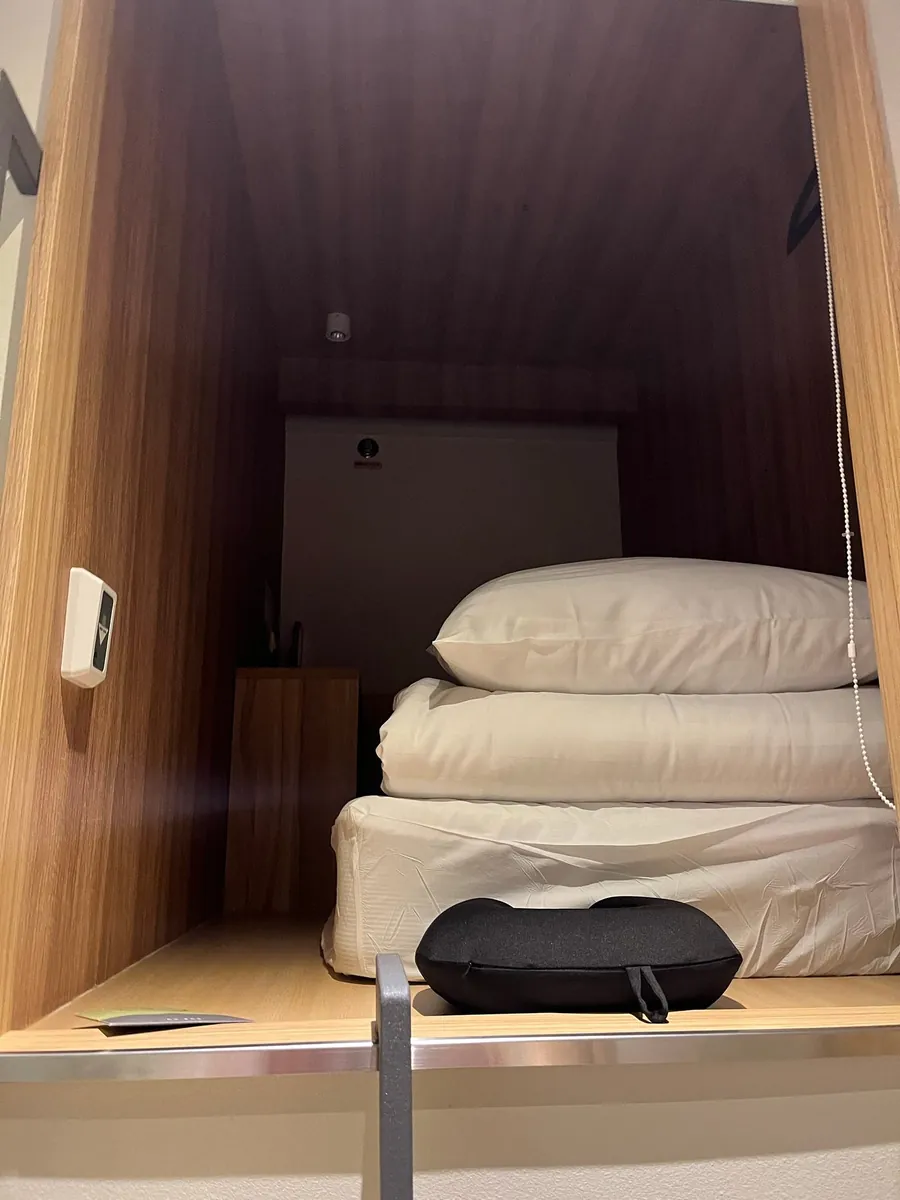 マットレスは厚みがあり、長さも十分で、176cmの私でも問題なく寝られました。環境は清潔で、照明は温かみがあり、エアコンも快適です。ただ一つどうしようもないのは、隣の人のいびきが聞こえてくることです。(そのため、入口で無料の耳栓が提供されています)