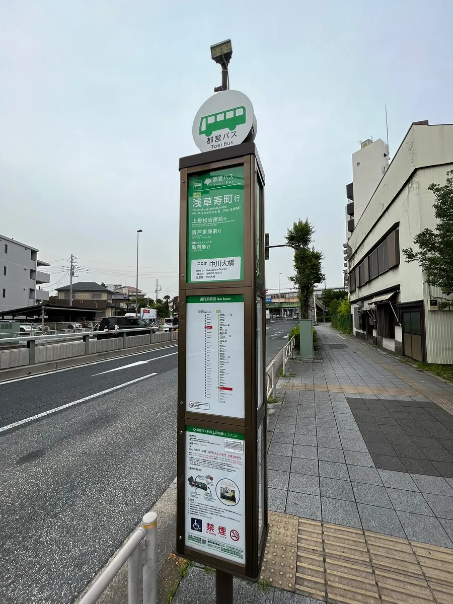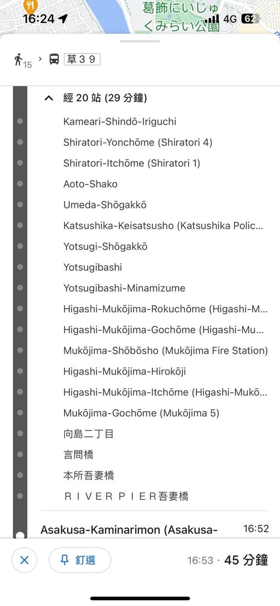 地図を見てバスで浅草に行く方が近いので、ルートを調べてバス停まで歩いて約15分かかりました: