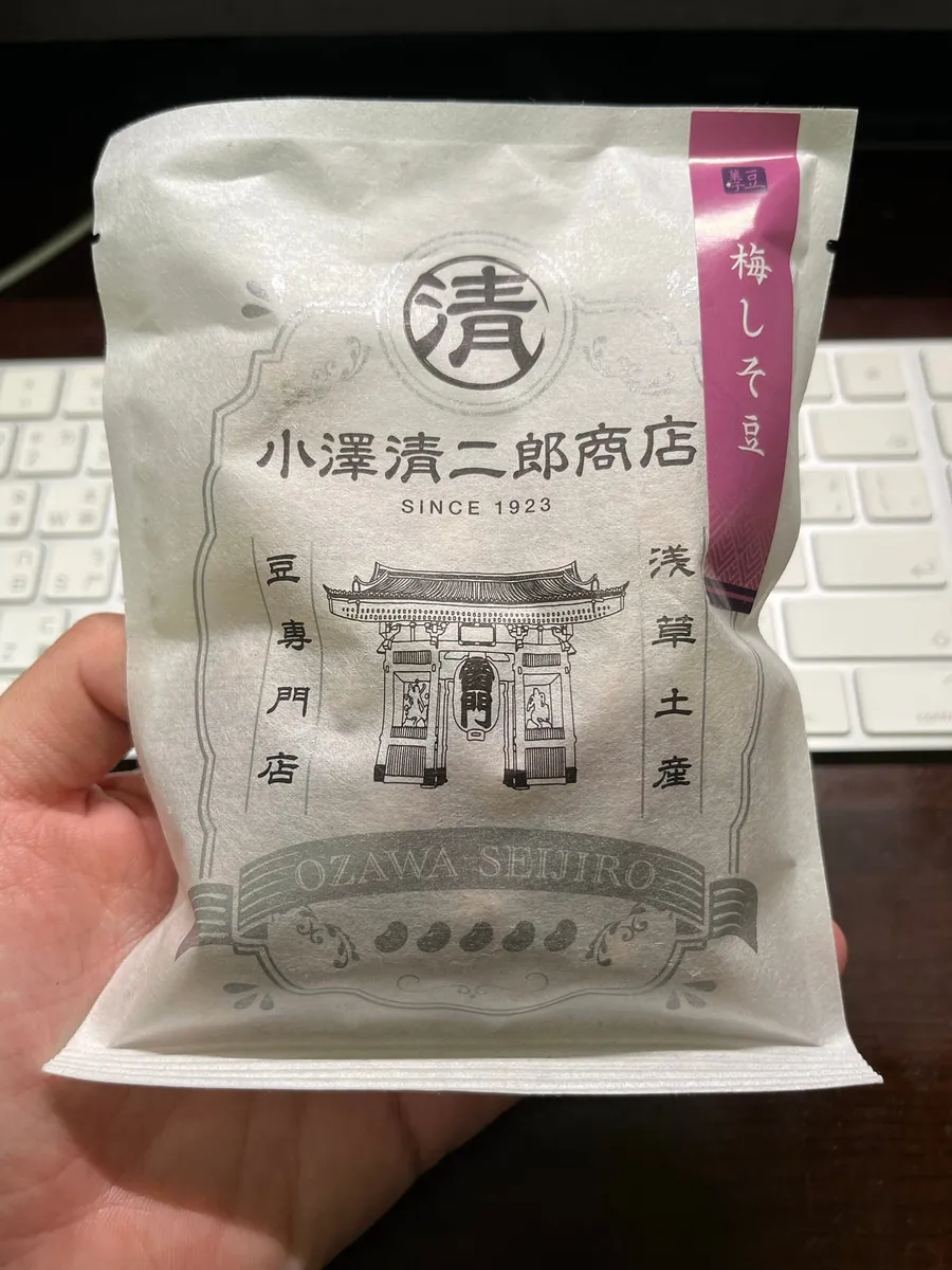 浅草寺の内側へ進むと、観光客が非常に多く、最初は何も買うつもりはなかったが、ただ見に来ただけだった。途中でこの豆屋さんを見つけて、意外に美味しくてお土産に買った。