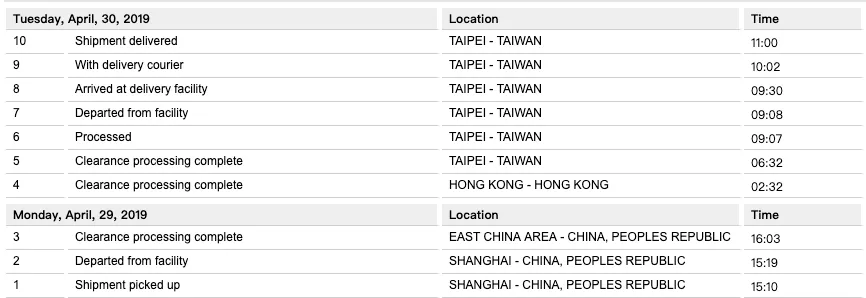 公式の予定到着日は5/3〜5/10で、4/29に上海から発送通知がありました。幸運にも4/30に51労働節の休み前に受け取ることができました(超速!!上海から台北まで)。