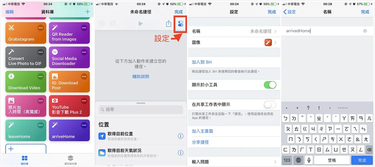 右上の「+」をクリックしてショートカットを作成 -> 右上の完了ボタンの下にある設定ボタンをクリック -> 名前 -> 名前を入力(英語推奨、後で使用します)