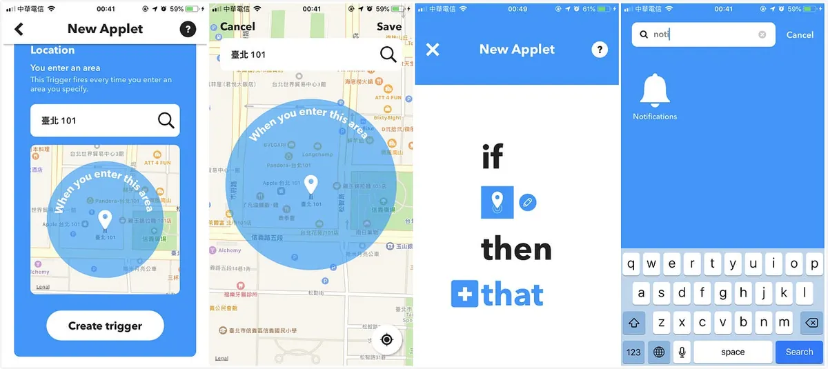位置を設定 -> 「Create trigger」をクリックして確定 -> 次に下の「+that」をタップ -> 「notification」を検索