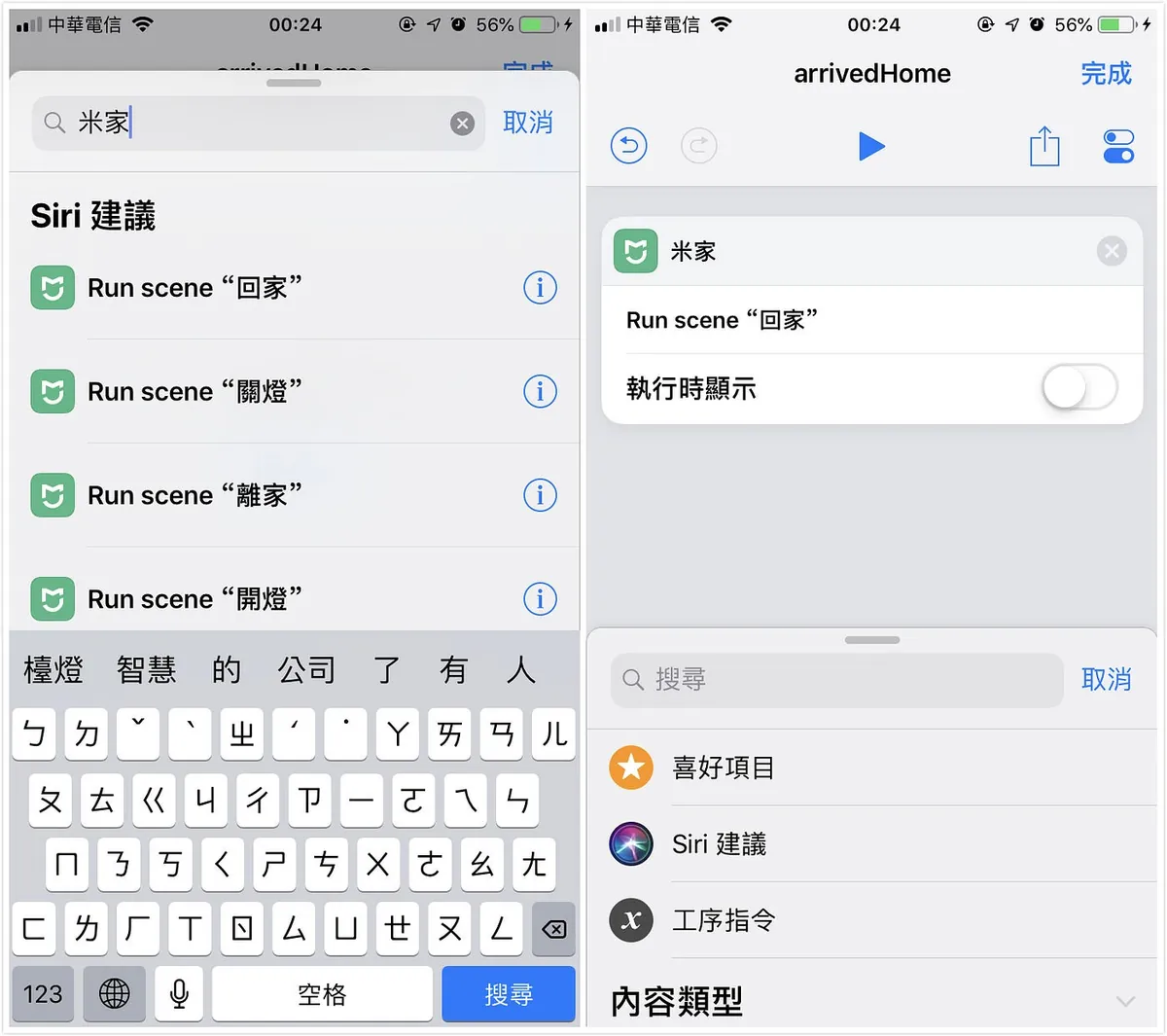 ショートカット追加ページに戻り -> 下部メニューの検索欄に「米家」と入力 -> 米家で設定した対応するシーンを追加し、「実行時に表示」をオフにする。そうしないと実行後に米家アプリが開きます。