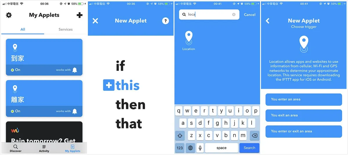 この時、再びサードパーティのアプリを使います。IFTTTを使ってGPSの入退場をバックグラウンドトリガーに設定します。App Storeで「 IFTTT 」を検索してダウンロード&インストールしてください。