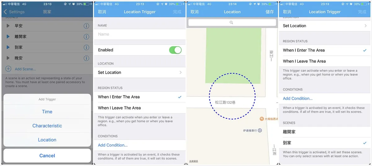 Trigger タイプで「Location」を選択 -> Name に名前を入力(例:帰宅)-> 「Set Location」をタップして位置エリアを設定 -> 次に REGION STATUS でエリアへの「入る」か「出る」を設定 -> 最後に SCENES で実行したい「シーン」(上で作成したもの)を選択