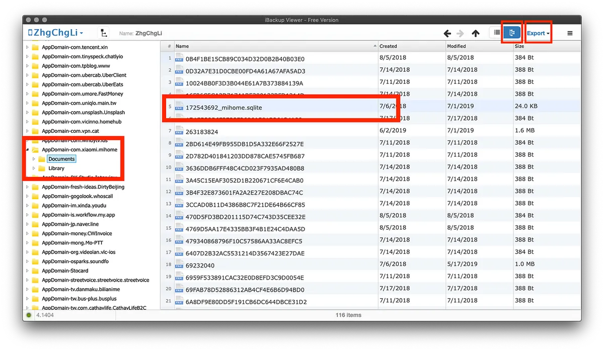 左側にはインストールされているすべてのAPPが表示されます。米家のAPP「AppDomain-com.xiaomi.mihome」->「Documents」を見つけてください。