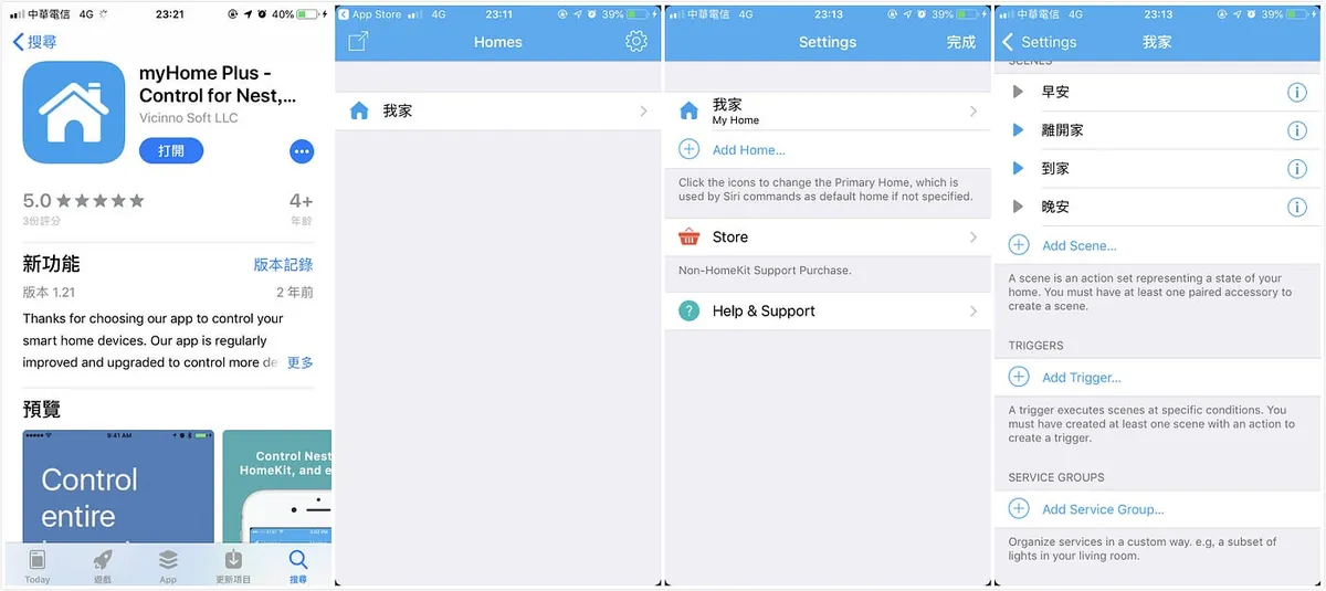 ダウンロード&インストール後にアプリを開く -> 「ホームデータ」へのアクセスを許可 -> 「ホーム」のデータ設定が表示される -> 右上の「設定ボタン」をタップ -> 「マイホーム」を選択して入る -> 下にスクロールして「Triggers」エリア -> 「Add Trigger」をタップ