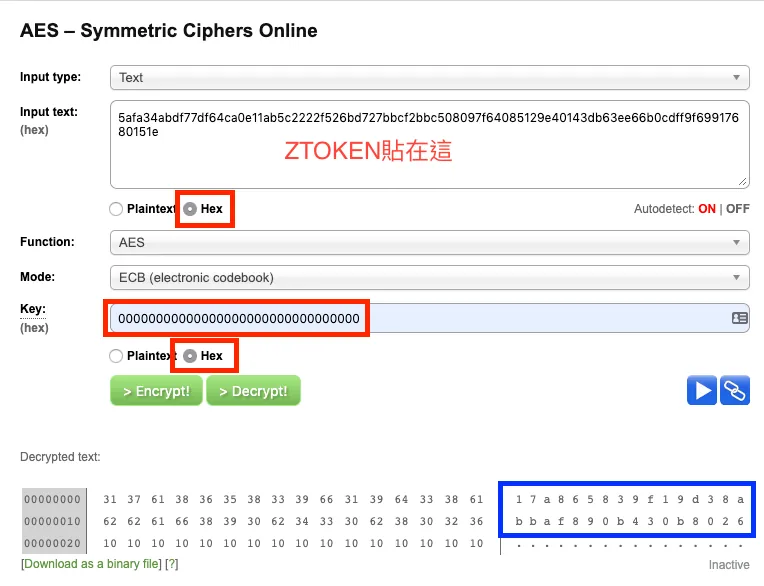 最後に http://aes.online-domain-tools.com/ のサイトを開き、ZTOKEN を最終的な Token に変換します。