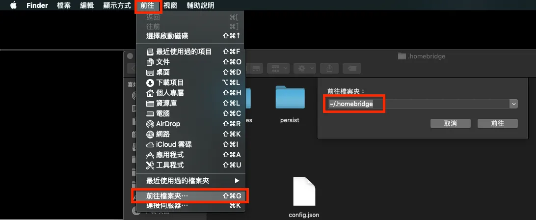 「Finder」->「移動」->「フォルダへ移動」-> 「~/.homebridge」と入力して移動