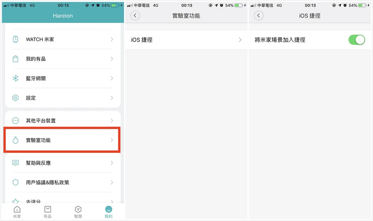 *もし米家が見つからない場合は、米家APPに戻り、「マイ」->「実験室機能」->「iOSショートカット」->「米家シーンをショートカットに追加」をオン・オフして、「ショートカット」APPを再起動してください。