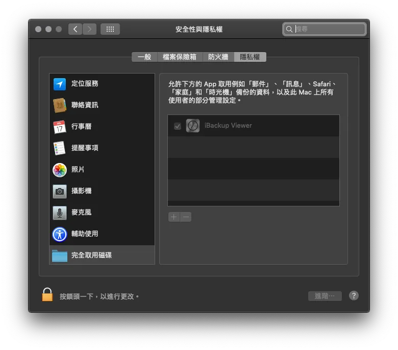「iBackupViewer」を開くと、初回起動時にMacの「システム環境設定」-「セキュリティとプライバシー」-「プライバシー」-「+」から「iBackupViewer」を追加するよう求められます。