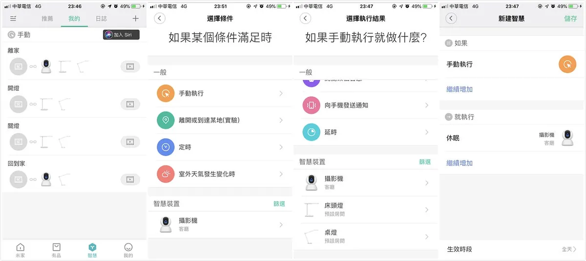 「ホーム設定方法」-> 「スマート」タブに切り替え -> 「手動実行」を選択 -> 下部でデバイス操作を選択(ネイティブ対応なのでより多くの機能が選べます) -> 他のデバイス(デスクライト)を追加 -> 「保存」で完了!