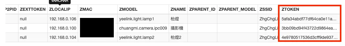 米家APPのすべてのデバイス情報欄を表示し、右にスクロールして一番端まで移動し、ZTOKEN欄を見つけて、ダブルクリックして全選択しコピーします。