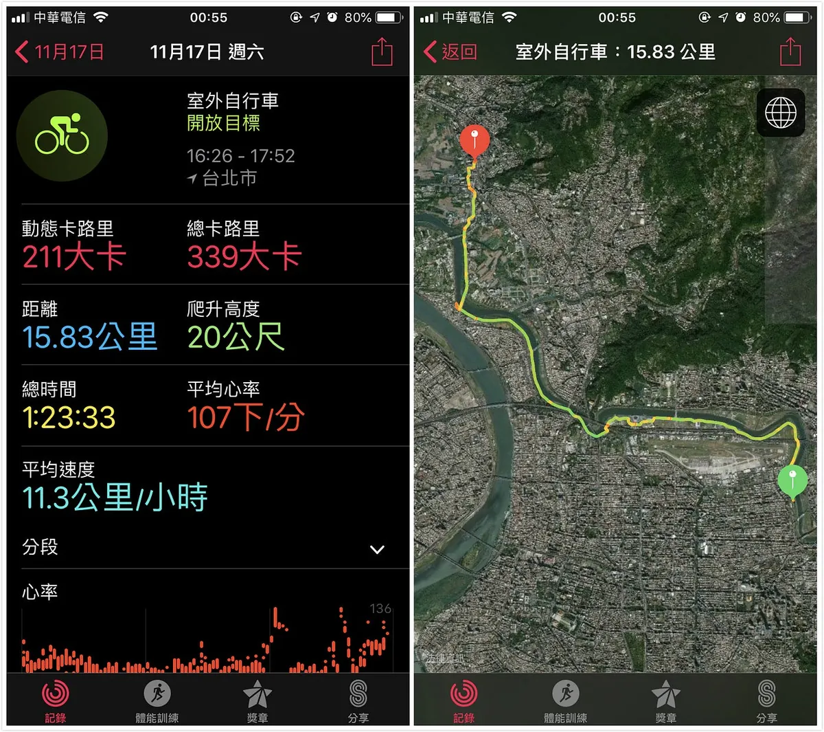 体力トレーニングのランニングはNike Run Clubを使っており、内蔵アプリは使っていません。先週、自転車に乗った時に内蔵の体力トレーニング→「屋外サイクリング」を試してみました。高度、距離、時間、ルート、心拍数が記録されて、とても良かったです!