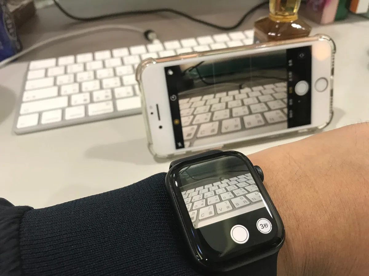 Apple Watchで「カメラ」を開くと、同時にiPhoneのカメラも起動し、時計からiPhoneのカメラを操作して写真撮影や動画録画ができます。強く押すとレンズ切替やカメラ設定が可能です。
