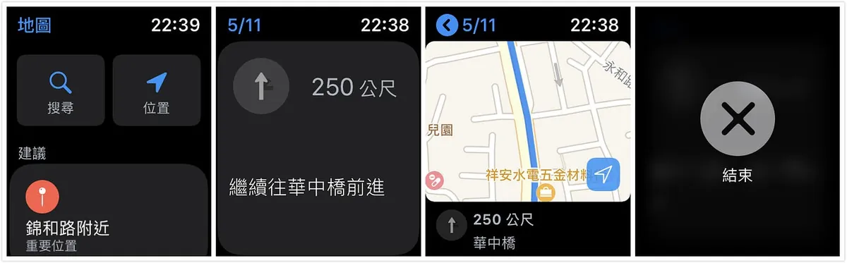 現在はApple Mapのみ対応しており、Google Mapは未対応です。「マップ」を開いて検索するか、個人情報設定の会社や自宅の住所(連絡先情報->マイカード)、連絡先情報、または目的地を手動で入力してください。ナビゲーションを開始すると、各曲がり角がカードとして表示され、走行に合わせて自動でページが切り替わります。回転して確認でき、タップすると地図の詳細を表示します。残り距離が40メートルになると振動で通知され、強く押すとナビゲーションを終了できます。