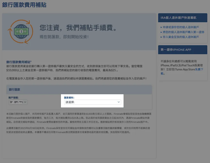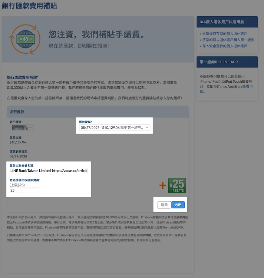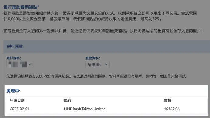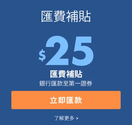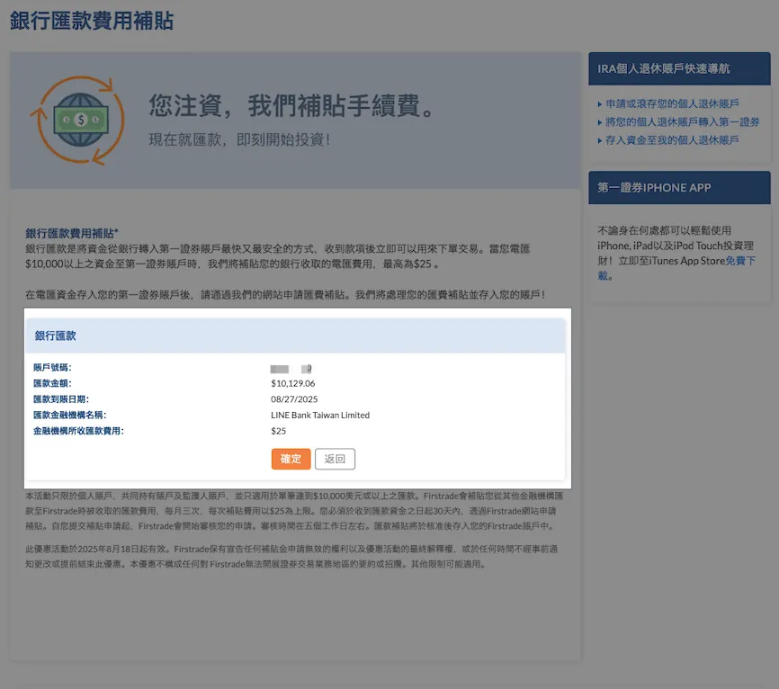 一度の送金額が多いほど割合は低くなります。Firstradeへの単一入金が$10,000米ドル(約310,000台湾ドル)を超えると、最大$25米ドル、月3回までの入金手数料補助を申請できます。申請は送金後30日以内に行う必要があります(詳細は記事末の解説を参照)。