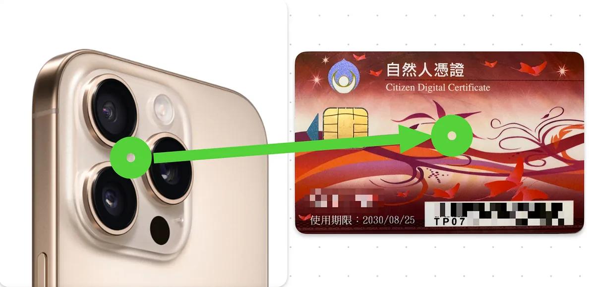 自然人認証カードの読み取り範囲はやや狭いため、何度か試してやっと成功しました;iPhoneのカメラ中央をカードの中央に近づけ、カードを左右に動かしながら数回試すと認証が成功します。