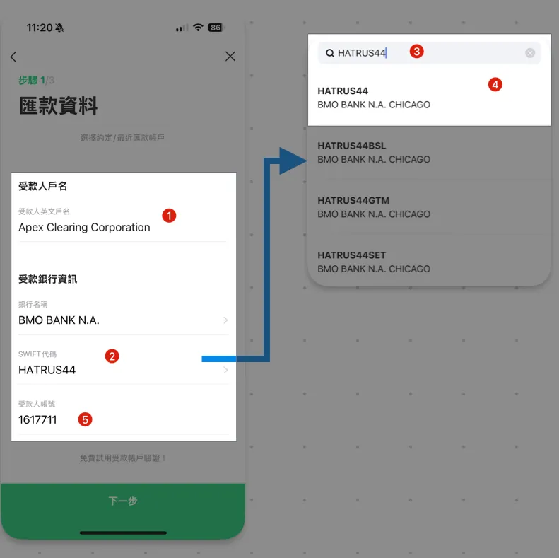 前のステップの送金情報を参考に入力してください:8桁の口座番号 + 口座名義