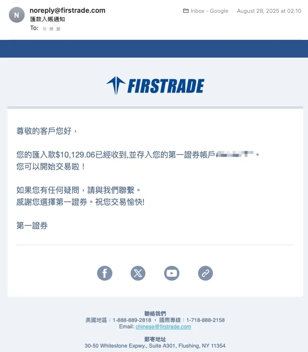 上記の図のように、8月27日午前9時にはすでに入金が確認されていましたが、Firstradeが入金を確認し、入金通知メールを受け取ったのは8月28日午前2時10分でした: