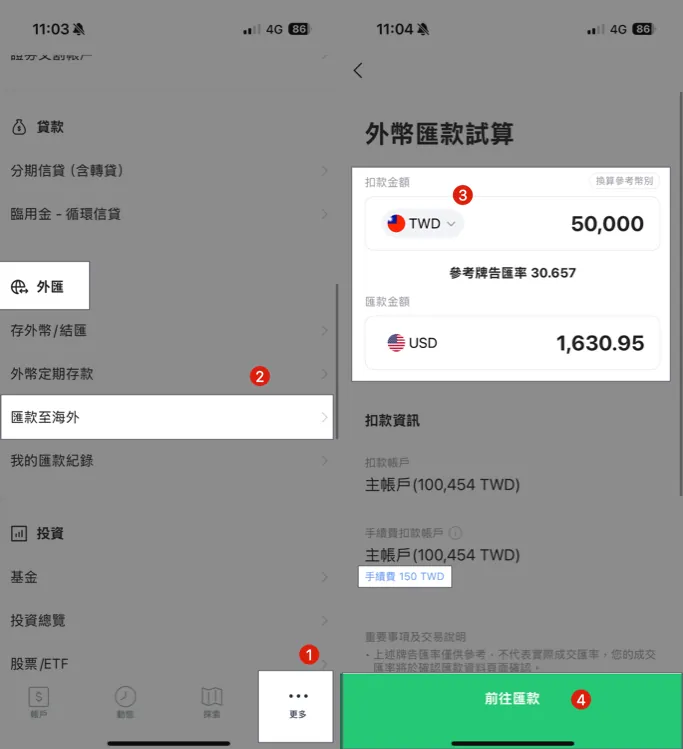 送金 NTD $50,000 / 手数料 NTD $150 = 0.3%