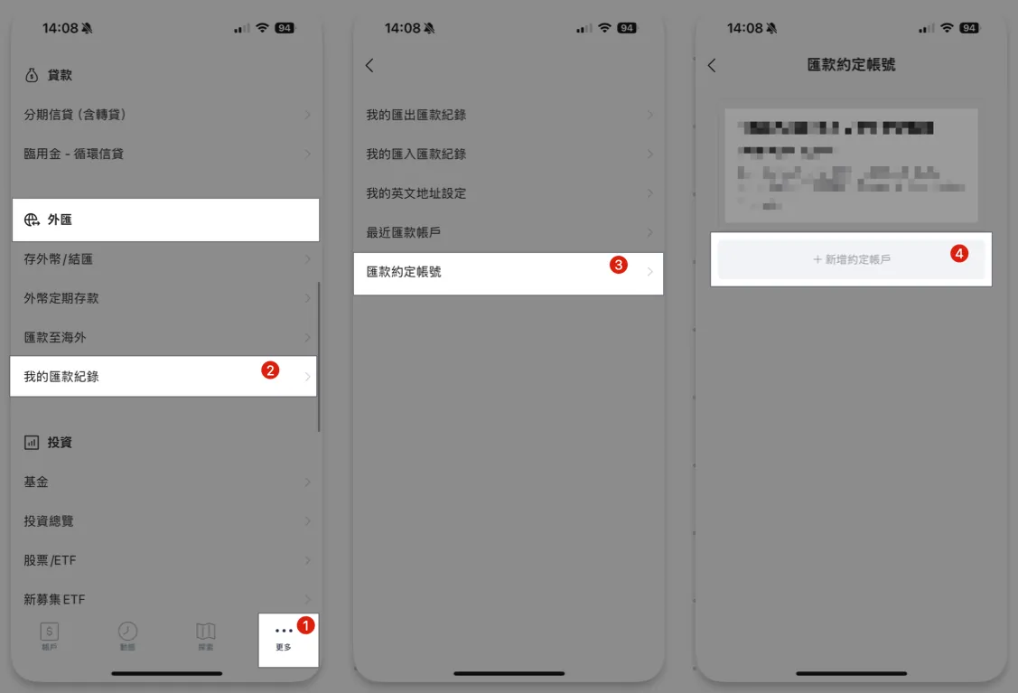 LINE Bankアプリを開く → 「もっと見る」 → 下にスクロールして「外貨」を見つけ、「私の送金記録」をタップ → 「送金約定口座」 → 「約定口座を追加」。