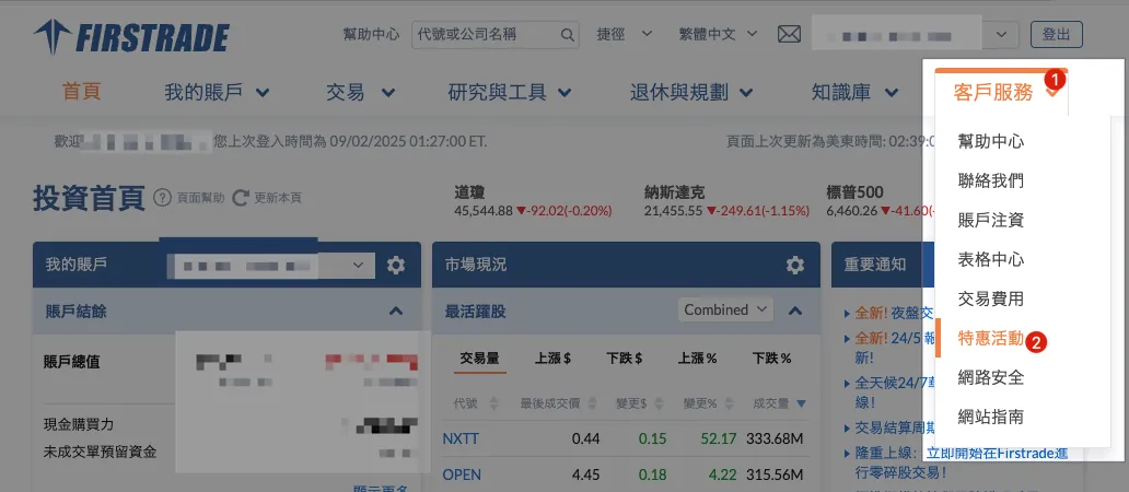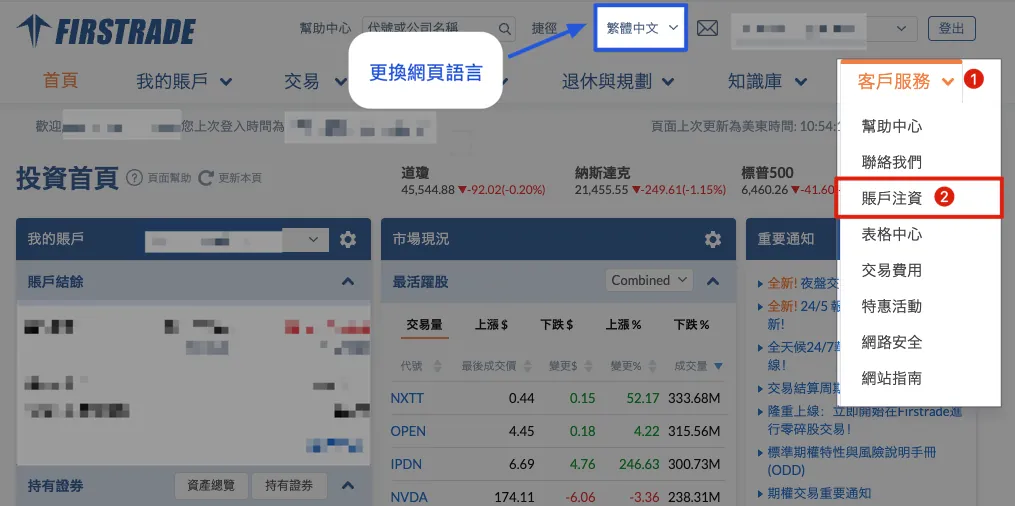 (パソコン版を使用してください) Firstradeにログイン後、以下を選択してください: