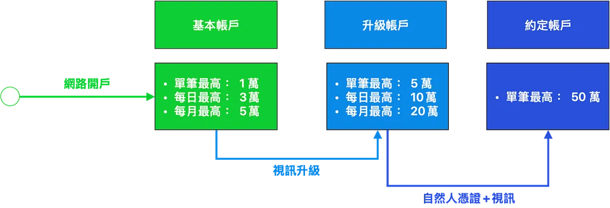 (口座開設後すぐに利用可能)基本アカウント:1回あたり最大1万円、1日あたり最大3万円、1か月あたり最大5万円。