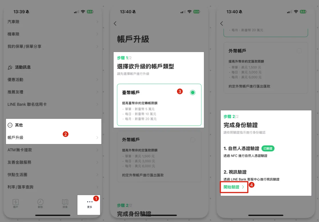 LINE Bankアプリを開き、「もっと見る」から下にスクロールして「その他」→「口座アップグレード」を見つけ、アップグレードする口座タイプを選択 → 2. ビデオ認証「認証開始 >」を選択。