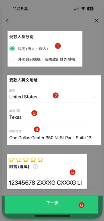One Dallas Center 350 N. St Paul, Suite 1300, Dallas, TX 75201(前のステップの送金情報を参照)⭐️️️️️️ 最も重要なメモは必ず記入してください