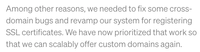 資料を調べると、2012年頃にこの機能が開放されており、料金は一回限りの設定費用75ドルでした。しかし、私がMediumを書き始めた2018年にはすでにこの機能は停止されていて、既に申請しているものは影響を受けませんでした。そのため、Mediumを見ていると、自分のドメインを使っているのにサイトはMediumというケースを時々見かけます。かっこいいですね。聞くところによると、リリース後すぐに撤回されたそうで、私の推測では商業的な理由から、自カスタムドメインがMediumの認知度を下げるためだと思います。