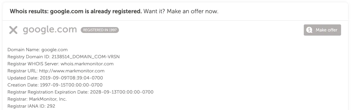 右側のボタンが「 Make offer 」または「 Taken 」と表示されている場合、そのドメインは既に登録されています。別の後継やドメイン名を選んでください: