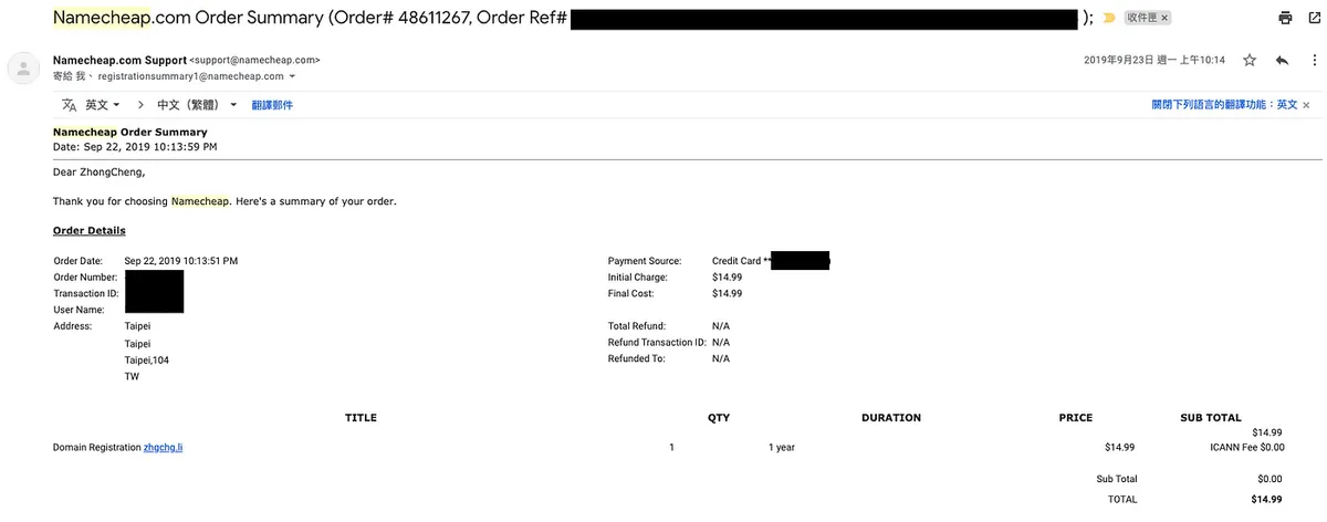 お好みに応じて Namecheap(本記事ではこれを例にします)や Godaddy から取得できます。一般的な .com ドメインは年間約200〜500台湾ドルです。ドメインの後継や長さによって価格は異なり、希少なものは数百万から数億にもなることがあります。