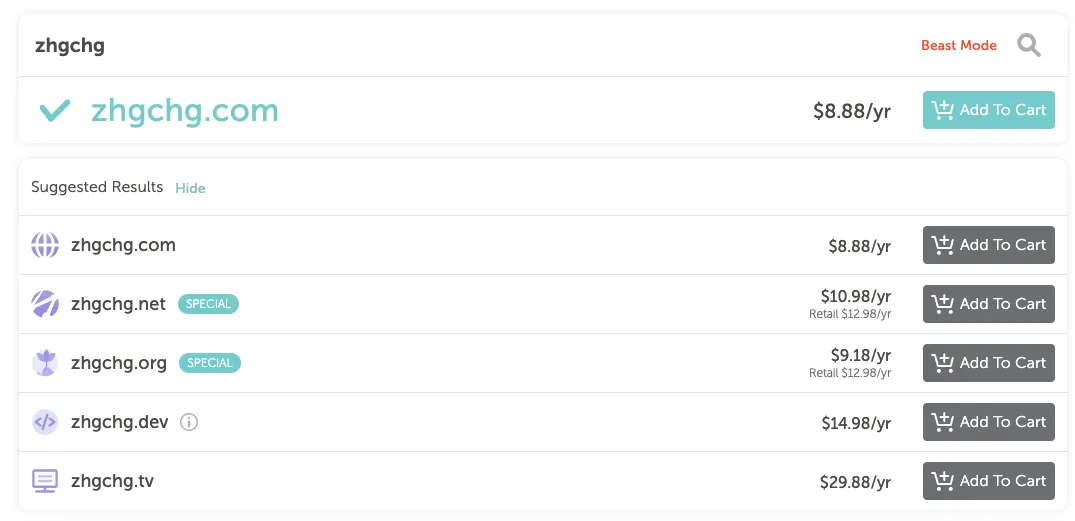 右側のボタンに「 Add To Cart 」と表示されている場合、そのドメインはまだ登録されておらず、カートに追加して購入できます。
