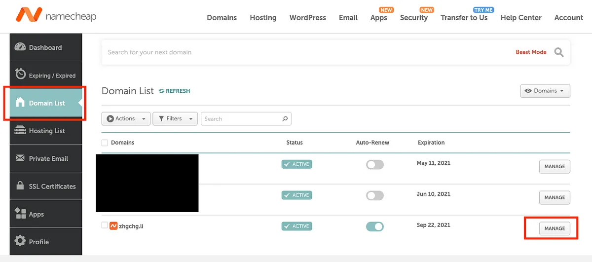 「 Dashboard 」に入り、「 Domain List 」タブに切り替えて、購入したドメインを見つけて「 Manage 」をクリックします。