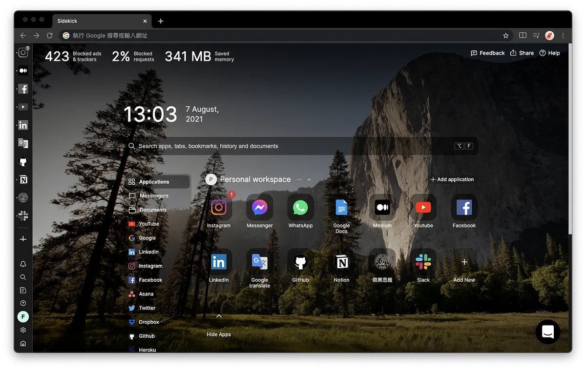 この間使ってみて、無痛で移行できたおかげでChromeを完全にやめました。どうしてもChromeで開かなければならないものは特にありません。最も使いやすいのは左側のApplicationsで、仕事でよく使うサイトを左側に追加して、素早く切り替えたり最新の通知を受け取ったりできます。