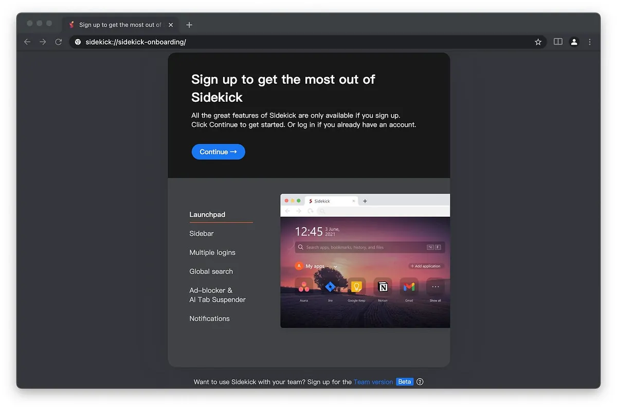 目に入るのは Sidekick の紹介ページで、上部の「Continue」をクリックして続行します。