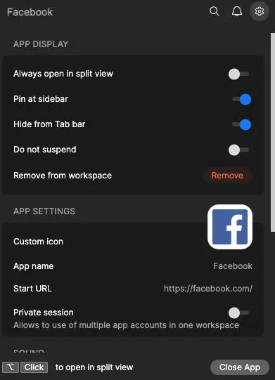 ただのウェブサイトのショートカットではなく、MacOSのDockのように使えます。Applicationのウェブサイトが起動するとブラウザに常駐し(左側に小さな点が表示されます)、同時にメモリ管理も適切に行われます。起動中のサイトに通知がある場合は、数字でお知らせします。