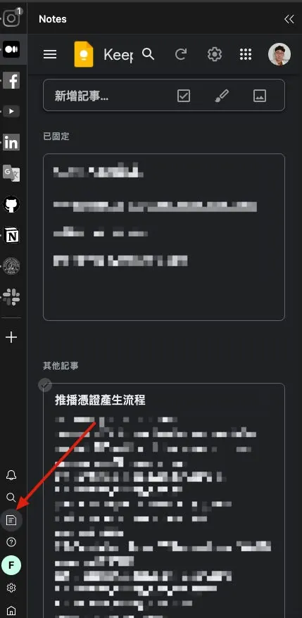 内蔵のGoogle Keepクラウドノート機能では、左下のドキュメントアイコンをクリックすると、すばやくGoogle Keepを開いてメモを取ることができます。