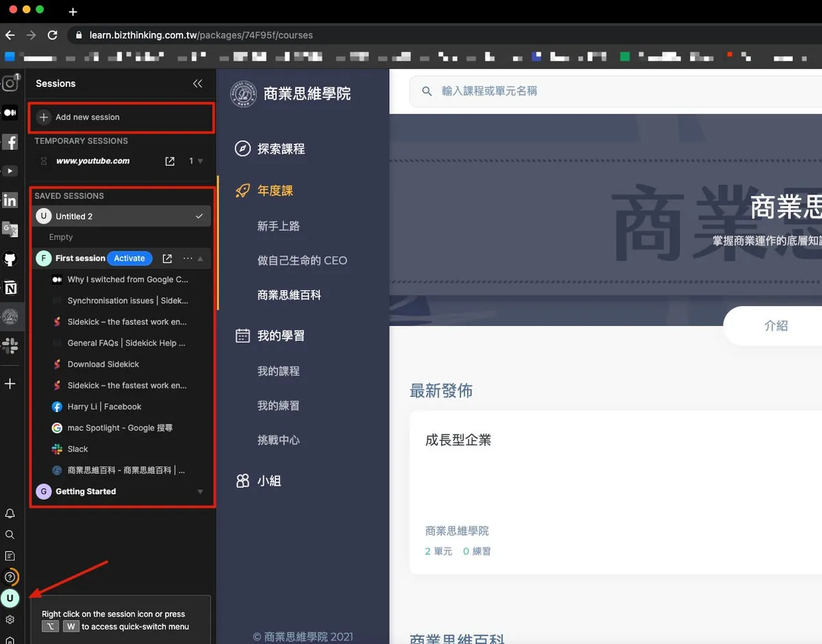 上部の「Add new session」をクリックすると、現在のタブの状態を保存し、新しいクリーンなブラウジング環境を開くことができます。