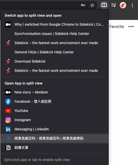 MacOSには標準でウィンドウ分割機能がありますが、私はほとんど使いません。完全に集中したい時以外は、多くの場合ウェブコンテンツを参照しながら他のMacOSアプリを使う必要があるため、その際にブラウザ内の分割ウィンドウ機能が非常に便利です。