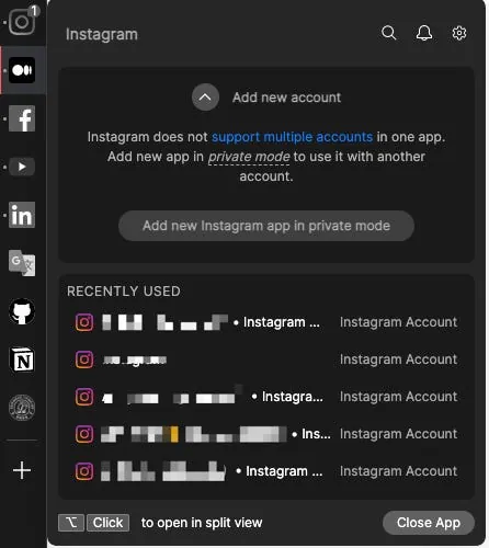 Applicationで右クリックすると最近の閲覧履歴を素早く確認でき、さらに複数アカウントの切り替えにも対応しています。