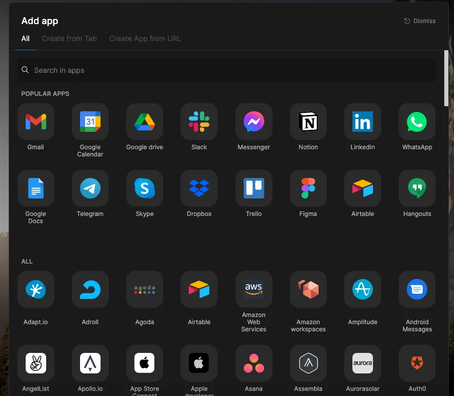 Applicationはホームページから素早く追加でき、Tabから作成したり、手動でURLやアイコン画像を入力して追加することもできます。